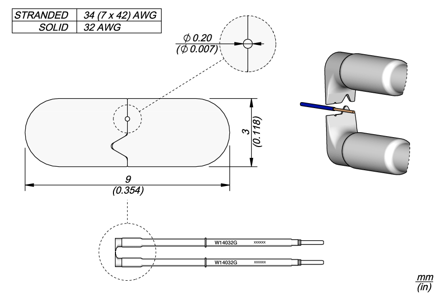 W14032G is specially designed for stripping high-temperature wire insulations made of thermostable materials such as Teflon*, Kapton*, silicone rubber, etc, of 32 AWG (Ø0.20 mm / Ø0.0079 in).